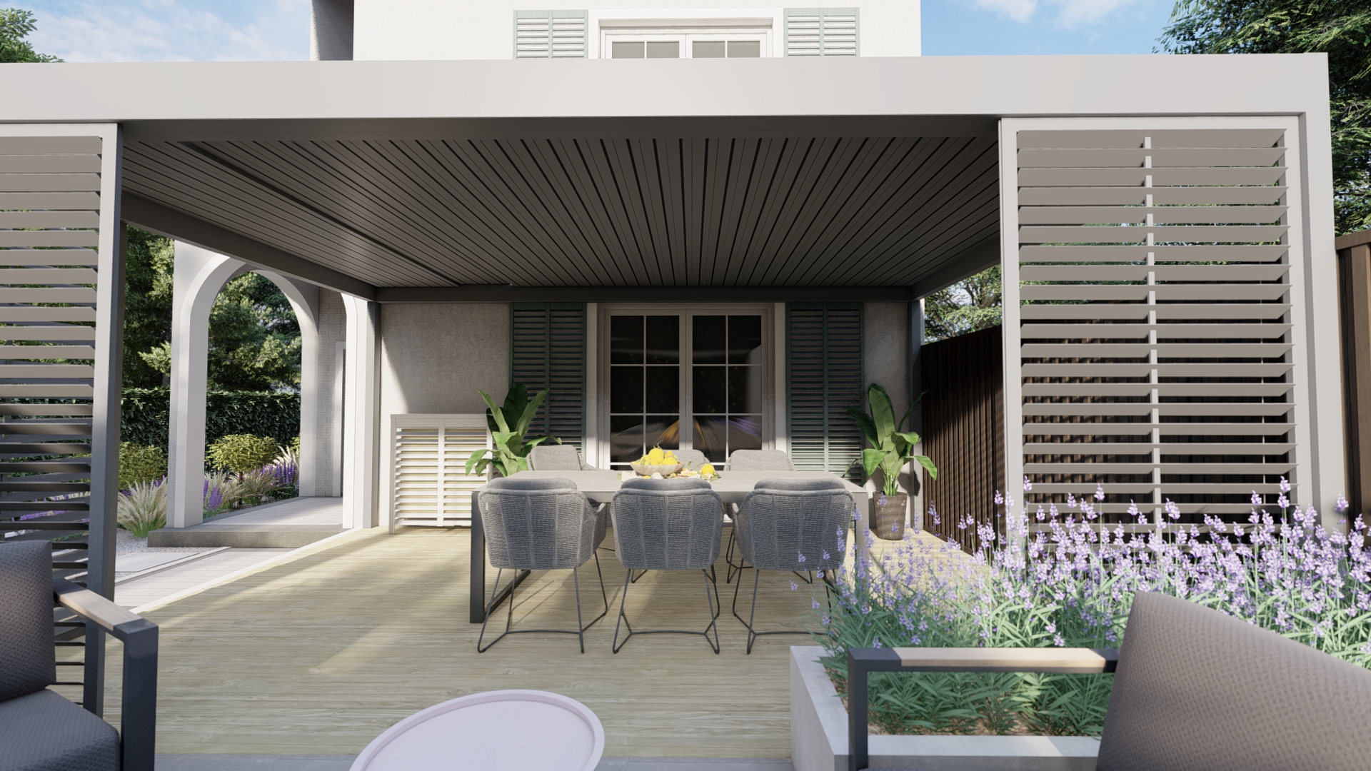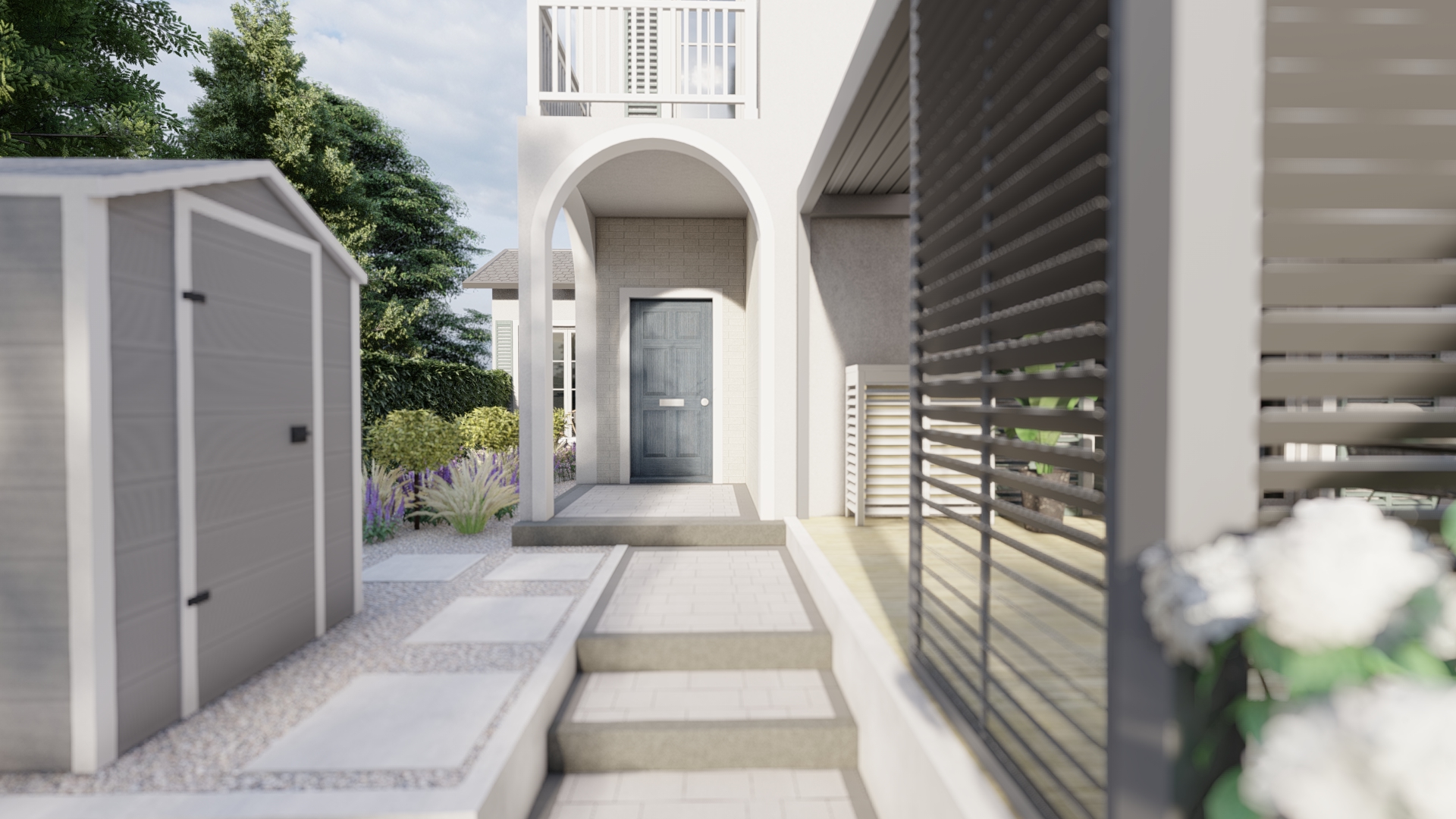 Zlikwidowano istniejący garaż, aby uzyskać więcej przestrzeni i miejsca na rośliny. Ogród znajduje się w Gdyni, zatem jego kolorystyka i faktury nawiązują do morza. Rośliny o niebieskich i fioletowych kwiatach, szumiące liście brzóz oraz traw wraz z charakterystyczną dla Pomorza wydmuchrzycą piaskową przywodzą na myśl bliskość plaży i szumu fal.