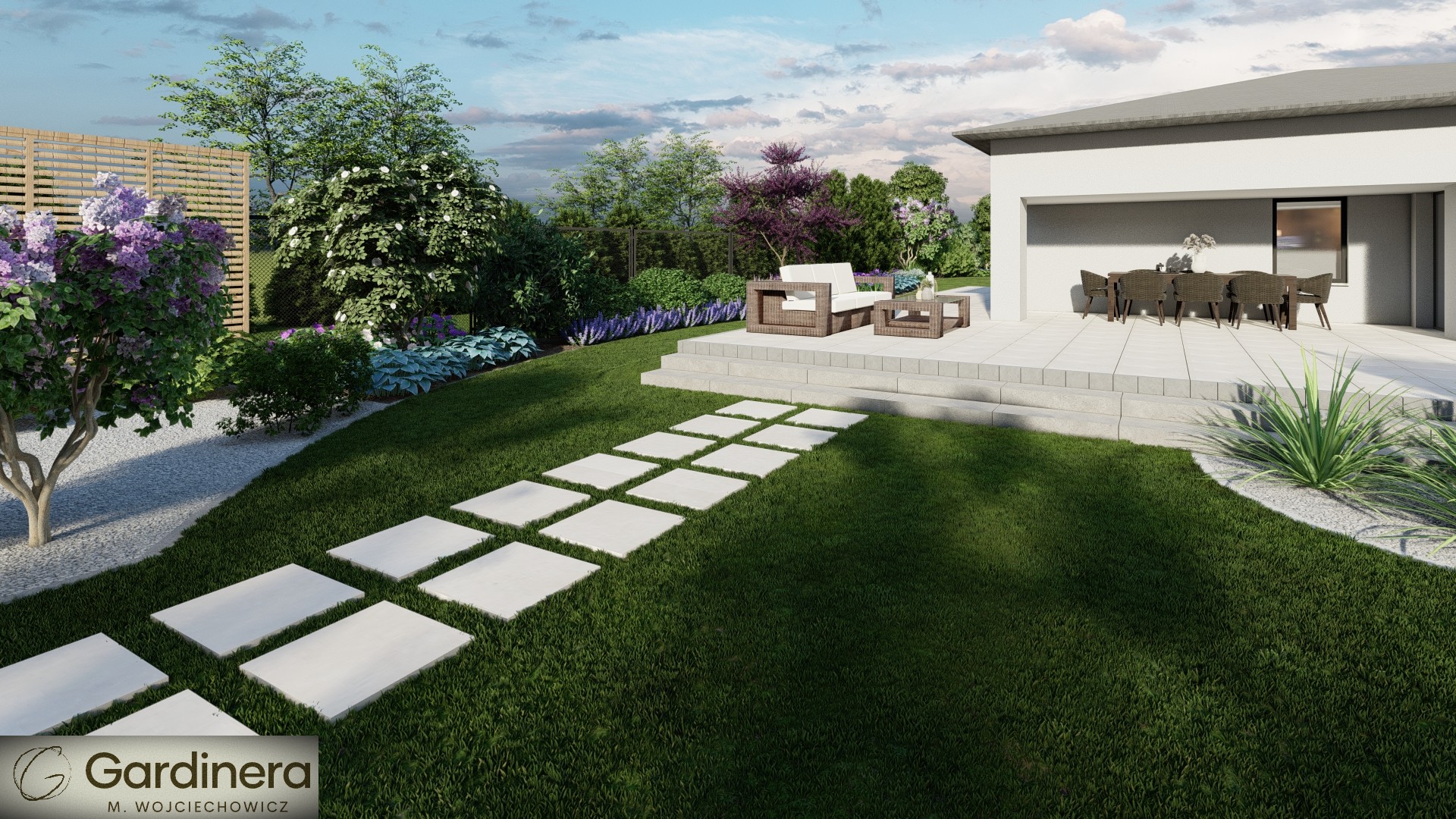 Linia trawnika prowadzona jest łagodnymi łukami. Wyznaczono miejsce na palenisko oraz warzywnik oraz krzewy owocowe.