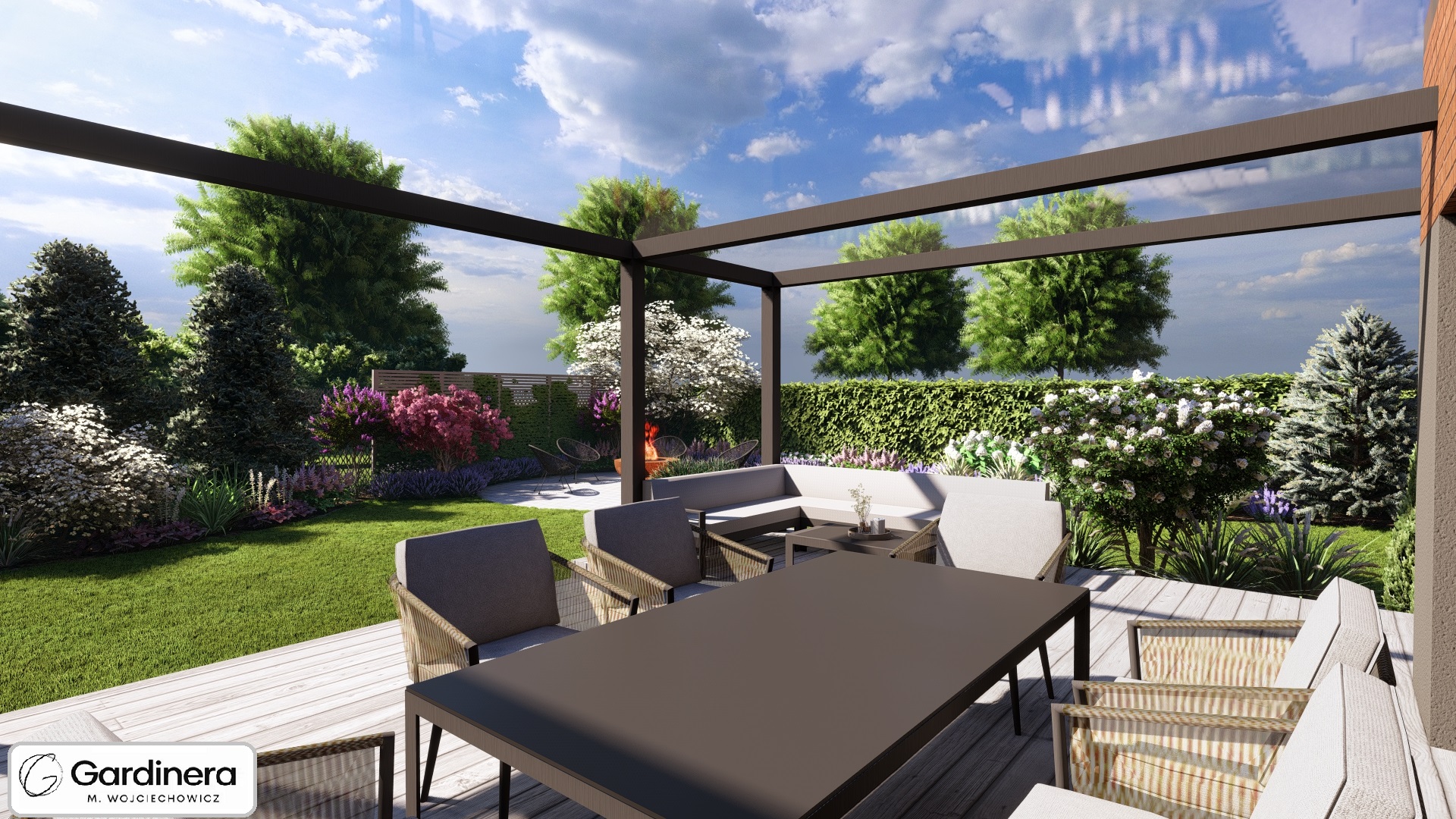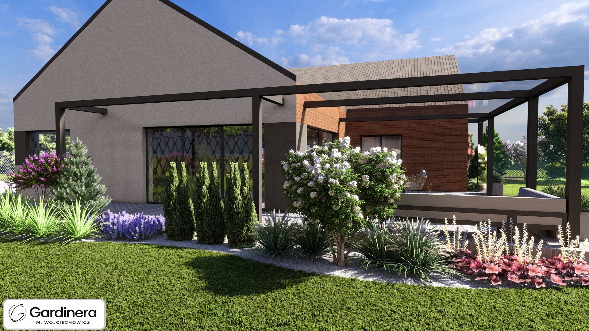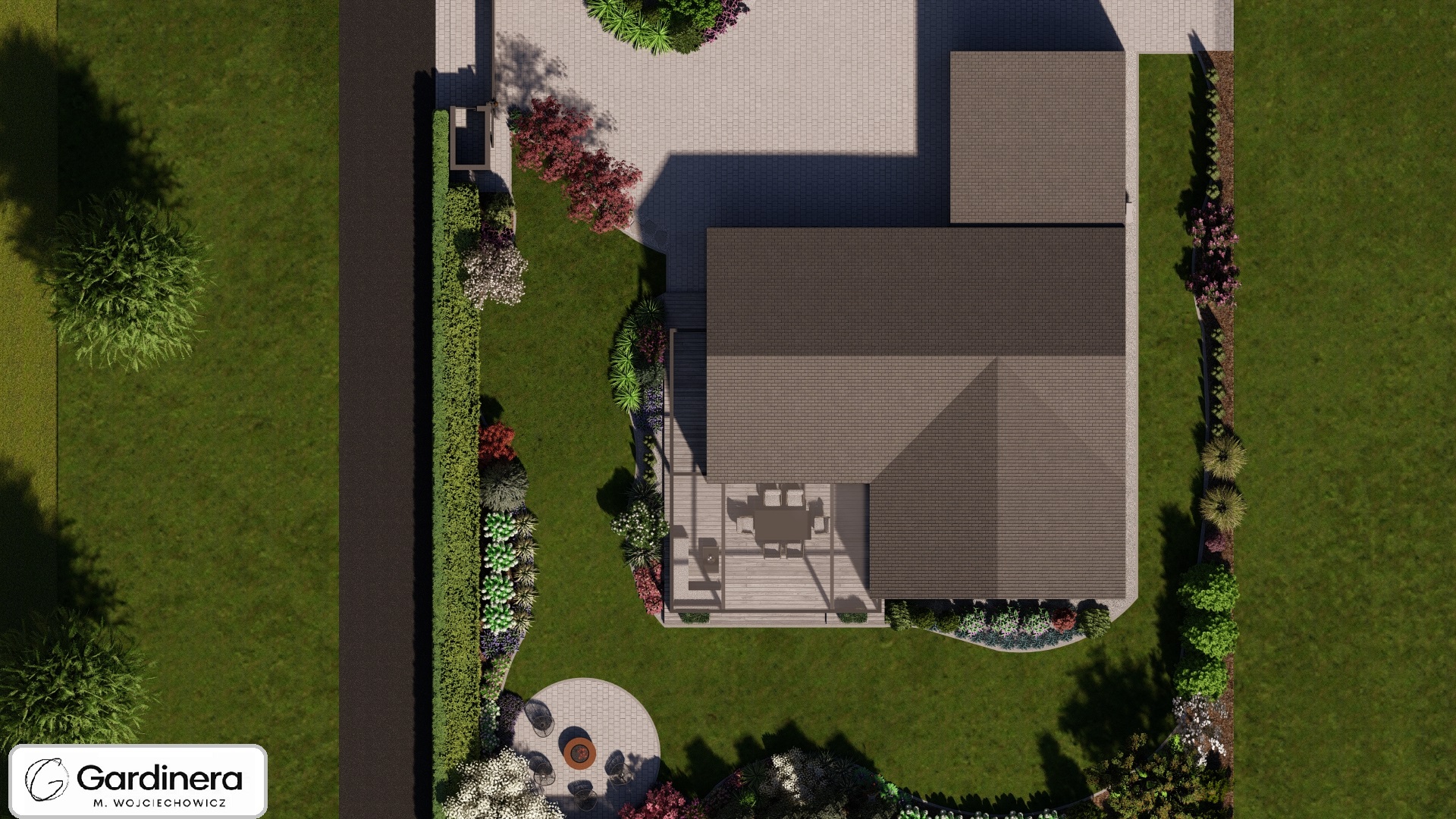 Ogród jest bardzo praktyczny, posiada duży podjazd, a także taras na którym można spędzać czas w gronie najbliższych.