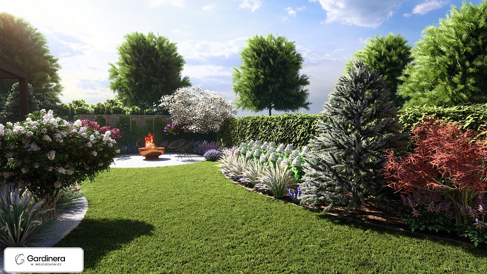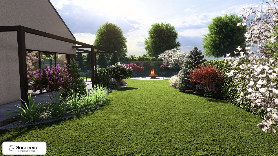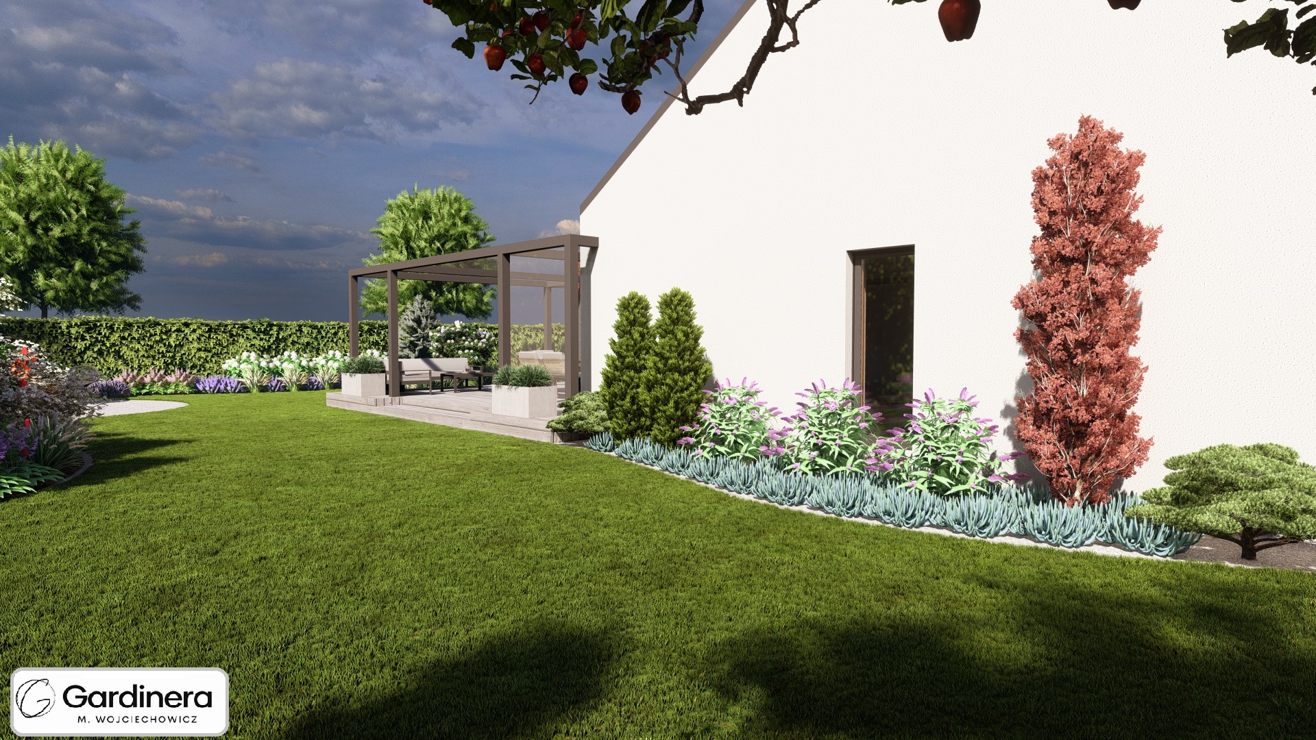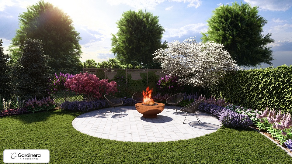 Fiolety, róże i biel są dominującymi barwami w tym ogrodzie. Budleje, róże na pniu, lawendy oraz wiele innych kwitnących roślin powodują, ze ogród ten jest pełen życia. Na trawniku wyznaczono miejsce na palenisko. Jest to prawdziwy rodzinny ogród, w którym znalazły się także donice do uprawy warzyw, a także krzewy i drzewa owocowe. Na dużym trawniku z powodzeniem można postawić trampolinę oraz basen.